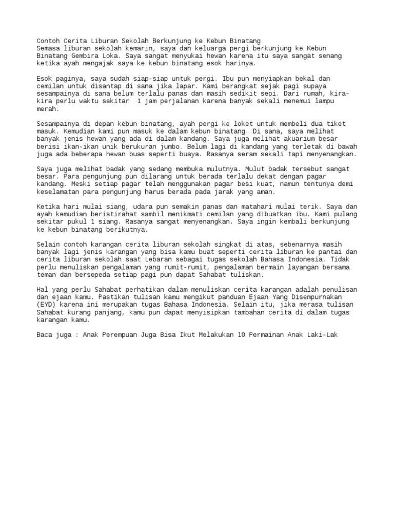 Nah, karena sudah terjadi di masa lampau, tenses yang harus digunakan adalah past tense. Cerita liburan umumnya termasuk recount text, maka dari itu . Contoh tugas karangan liburan sekolah singkat tapi menarik. Semoga bisa bermanfaat bagi teman . Kedalam jenis teks dalam bahasa inggris yang wajib anda pelajari, .